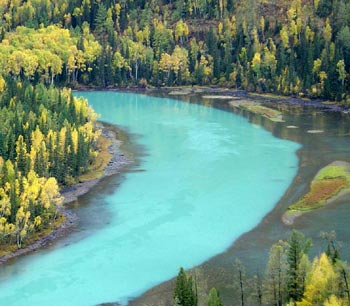 All the way from the town of Burqin, the seat of the government of Burqin County, the northernmost territory of Xinjiang, which sits 150 kilometres south of Lake Kanas, we found ourselves in a drive-through gallery of Mother Nature's marvels. Even whimsical weather, by and large an unwelcome variant for the average traveller, proved to be a bonus here. The ground was wet, the air chilly and humid at dawn. Dim sunshine from behind thick clouds set us worrying about poor weather ruining our tightly-scheduled pilgrimage to what is said to be the epitome of Xinjiang's scenic beauty. Almost immediately after our vehicle breezed past lush poplars and white birches embracing Burqin, we found ourselves sandwiched between a brownish plain stretching out as far as the eye can see and dark cloud cover as large as the sky. Only a slim belt of pale grey was left on the distant horizon in front of us in the north. Now and then, dazzling lightning ran across the clear horizontal split of the sky, tearing apart the seamless darkness above. Heavy raindrops began to knock on when we were 80 kilometres or so from Burqin at the foot of the Chunghuer Mountainpass. As the drumbeats above us became more furious and the downpour started running in streams down the windshield, bean-sized hailstones struck the hood of the car. The sky was brighter, with spots of blue, and the rain was milder on the other side of the 5-kilometre mountain pass. Yellow was taking over from green on the grassland of Halute, which means "Birds' Gathering Ground'' in Mongolian, one of Burqin County's major summer pastures. Morning sunshine squeezed out from white and grey clouds and across the light curtain of rain added a warm glow to the vast pasture. The yellow outside gradually gave way to deep red at an upland meadow. Felt-covered white tents of nomadic Kazaks dotted the gentle crimson slopes. Thin smoke rising from the tents transmitted a sense of tranquility in the warmth of the rising sun. No sooner had we left the realm of red than several other Kazak tents emerged in a meandering valley that led us all the way northward to Lake Kanas. In the thin morning mist, everything looked hazy -- the fading green of the grass, the grazing sheep, the tents, the herdsmen on horseback, and the morning sun. Up on the pale green slopes, sunshine penetrated sparse concentrations of Xinjiang larches, leaving behind long dark shadows. Vegetation appeared denser after we drove past Jiadengyu, the planned tourist camp 31 kilometres south of Lake Kanas, and followed closely along the Kanas River. At the bottom of the valley, the green-hued water ran vigorously south, with waves breaking and foaming against dark boulders. Up from the banks on the slopes, bright yellow crowns of white birches lit up the dark green of larches and spruce. Higher above, capricious white clouds, indistinguishable from fog rising from among the thick woods, gathered and dispersed on top of the mountains. A mild turn brought us to the front of Sleeping Dinosaur Bay. In the embrace of the handsome slopes, in the middle of a tranquil emerald pond, lay a fancy islet. Despite my inability to associate the islet's grotesque outline with what locals call a sleeping pterosaur, I was overwhelmed by the breathtaking view. Right before our eyes was the full spectrum of autumn's magical touches, from dark green to bright yellow. At the northern tip of the tranquil pool, through yellowish green larches, there was white foam seething on a slim shoal. Rain fell again at the Moon Bay, 1 kilometre north of the Sleeping Dinosaur, where the river made another curve through lush larches and spruce. Seen from above at a proper angle, the chartreuse arch below was exactly in the shape of the waxing moon. Three kilometres north was picturesque Fairy Bay, a broad shoal where crystalline ripples skirted around tiny isles. It is also called Pearl Bay, because on sunny days the thin ripples glisten as if the entire river were decorated with pearls. After another 2 kilometres, through a small village of the local Tuwas, who identify themselves as a branch of the Mongolian ethnic group, we were told Lake Kanas was right behind the thick woods. Rain subsided during our hasty boat ride on the lake. Not too far in the distance, a smooth arch of colours emerged from the fog that had veiled most of the mountain slopes around. The rainbow faded in and out in a matter of minutes, as sunshine became brighter and warmer. The green and yellow on the slopes appeared fresh and vivid after the rain. The lake had not shown its full charm until we scaled the well-paved steps and looked down from the Fish-Watching Pavilion. About 2,030 metres above sea level, the pavilion was one of the few artificial structures around Lake Kanas. From 660 metres above, however, you are not supposed to see any ordinary fish in the alpine lake. The name of the pavilion has something to do with one of Lake Kanas' many mysteries, whose name stands for "Beautiful and Mysterious'' in Mongolian. No guided tour of Lake Kanas is complete without the mention of the legendary "lake monster,'' whose head is as large as, if not larger than, a boat. Better informed locals may tell you experts guesses about that the so-called "monster'' is that it is actually a hucho taimen, a kind of large salmon. Despite the prevailing rumours and various reports of discoveries, there is no evidence of its existence whatsoever. Twenty-six-year-old Yang Cheng, who had been navigating the lake on cruise boats in the past five years confessed he had not had the luck to see it. As if to corroborate the expert anticipation, however, in the tiny little Kanas Museum not far from the lake, there is a 1.6-metre-or-so hucho taimen specimen on display. Environment-conscious local authorities have decided to demolish most existing buildings near the lake and move tourist service facilities to Jiadengyu, 30 kilometres away. The pavilion will stay because it is the only con