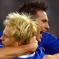 Fellow Italians Lazio, however, are in danger of early elimination after a 4-0 mauling by a rampant Chelsea side in Rome's Olympic Stadium, a result that leaves them bottom of Group G. Manchester United and VfB Stuttgart both took huge strides towards the second phase, crushing Rangers and Panathinaikos respectively in Group E. Madrid lost their 100 percent record in Group F as they were held by Partizan, but they still became the first club through to the last 16. Brazilian Ronaldo wasted numerous opportunities for a below-par Madrid, while their defence was run ragged at times by a Serbian side who almost snatched a famous victory when skipper Sasa Ilic shot wide from point blank range. Real have 10 points, three ahead of Porto who are favourites to join them in the next round after a 1-0 home victory against Olympique Marseille -- Dimitri Alenitchev scoring the winner. Brazilian midfielder Kaka's perfectly struck volley after 86 minutes secured a priceless victory for Milan to make up for a shock home defeat by the Belgians two weeks ago. The Italian club lost captain Paolo Maldini to injury after 33 minutes and then had Nesta sent off for a second bookable offence five minutes later. Milan coach Carlo Ancelotti paid tribute to his side's resolve. "The loss of Nesta was a very important moment for us," he said. "But we handled it well, we stayed calm and we worked our way back into the game. "Anything is still possible in this group so we shall have to see what happens, but the players showed great character and heart tonight." Milan, who have seven points, jump ahead of Ajax at the top of a tight Group H after the Dutch club were beaten 3-2 by Celta Vigo -- the Spanish club's first victory. Ajax have six points, Celta five and Bruges slip to the bottom on four. RANGERS OUTCLASSED Manchester United outclassed Scottish champions Rangers 3-0 in the so-called Battle of Britain at Old Trafford with Dutchman Ruud van Nistelrooy ending a lean streak with two goals after Diego Forlan had volleyed United ahead after six minutes. Champions League debutants Stuttgart stay top of Group E after coming from behind to beat Panathinaikos 3-1 in Athens, so ending the Greek club's hopes of reaching the last 16. Michalis Konstantinou put the hosts ahead, but Stuttgart replied through Takis Fyssas, Kevin Kuranyi and Andreas Hinkel. Argentine Hernan Crespo scored against his old club Lazio to begin Chelsea's rout in Rome and send the big-spending London club top of Group G. Lazio's Sinisa Mihajlovic was sent off in the 53rd minute for a lunge at Damien Duff, although the Serb was lucky not to be punished in the first half when he was seen to spit at Chelsea's Romanian forward Adrian Mutu. Eidur Gudjohnsen made it 2-0 in the 70th minute before Duff and Frank Lampard completed Chelsea's first European win in Italy. The only sour note for Claudio Ranieri's side was defender Glen Johnson's last-minute red card for kicking the ball away, his second bookable offence. Chelsea lead the group with nine points, three ahead of second-placed Besiktas after the Turkish club secured a deserved 1-0 victory over Sparta Prague thanks to a late goal from Brazil's Ronaldo Guiaro. Matches in Groups A-D take place on Wednesday when both Inter Milan and Deportivo Coruna could join Real in the lasrt 16.
