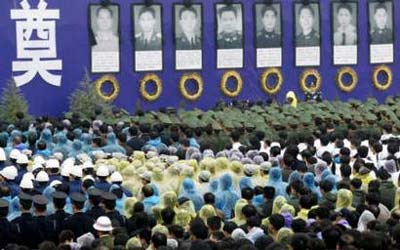 Woe and tears clouded the service as Xue Jiyong, father of the martyr Xue Xianglin, recalled his son. "I feel proud of my dear son," Xue said. "May you rest in peace, my dear fellow soldiers," said Yang Youliang, an officer in the Hengyang city firefighters unit. Zhou Yongkang, minister of public security, praised the firefighters' deeds and "dauntless heroism" in his speech. "These firefighters have set up dedicated examples for our university students," said Wang Kaibin of the Hengyang-based Nanhua University. Numerous citizens in the country posted messages of sympathy on the Internet, honouring the men. The Ministry of Public Security said it was the worst firefighting accident since the founding of the People's Republic of China in 1949. The firefighters had rushed into the eight-storey building just two minutes after a fire alarm was raised in Xuanting Village of Zhuhui District of Hengyang City at 5:43 am On November 3. The eight-floor building suddenly gave way, leaving two dead on site and 19