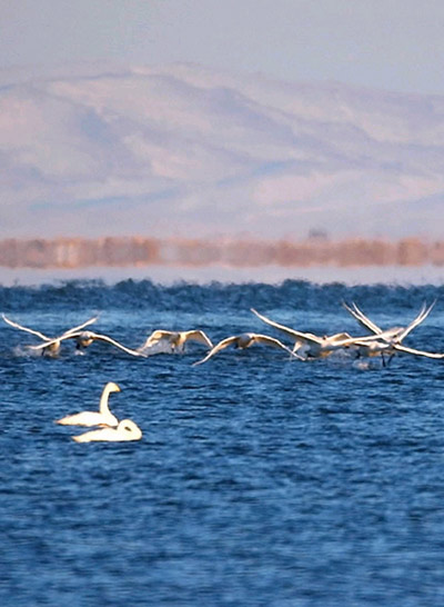 | | Swans enjoy a healthy and free life yesterday at the Dalai Nur Lake, in Hexigten Banner (county) of North China's Inner Mongolia Autonomous Region. The lake, a national nature preserve, attracts about 160 species of birds with its fresh water, surrounding marsh, grasslands and woods. [newsphoto.com.cn] |