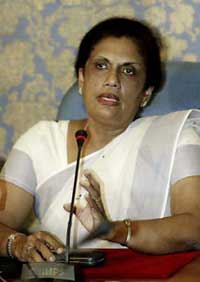 Sri Lankan President Chandrika Kumaratunga speaks to Buddhist priests during a briefing on the current situation in Colombo, Nov. 11, 2003.   [Reuters]