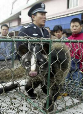 | | A confiscated civet cat paces inside a cage at a wild game market in Guangzhou, the capital of Guangdong province, November 12, 2003. Local police on Wednesday confiscated scores of unlicensed civet cats and other wild animals. Some experts believe viruses like SARS jump from animals to humans through the slaughter and preparation of wild animals for food. [Reuters] |