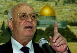 Palestinian Prime Minister Ahmed Qurie talks in front of a poster of Jerusalem's Dome of the Rock during a news conference after the first cabinet meeting of the new Palestinian government in the West Bank city of Ramallah Nov. 13, 2003.  [Reuters]