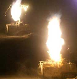 U.S. Army 4th Infantry Division soldiers fire mortars during a night attack on alleged loyalists of Saddam Hussein, outside Tikrit, Iraq,193 km (120 miles) north of Baghdad, Nov. 17, 2003. A new audiotape purportedly made by Hussein urged Iraqis to escalate their fight against the occuption, as a new U.S. military offensive against guerillas began an effort to take the fight to the enemy rather than responding to ambushes.  [AP]