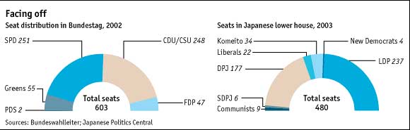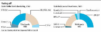 This cyclical turnaround should not obscure the deeper problems that still beset the two economic giants. Japan still suffers from "stubborn" deflation, in the words of Heizo Takenaka, Japan's financial-affairs minister. The country is producing more, but the prices it can fetch for those products are falling just as quickly. As a result, in nominal terms, Japan¡¯s economy actually shrank in the third quarter. Such stubborn deflation makes life harder for borrowers. On Friday, Japan's Financial Services Agency said that the country's big banks ought to set aside £¤900 billion ($8.3 billion) to cover losses on loans. Stockmarket investors, who have been betting on a recovery for most of this year, took some of their chips off the table on Monday, bringing the Nikkei average below 10,000 for the first time in three months. The German recovery is heavily reliant on foreign demand. Europe's titan has been waiting supine for America to pull it out of trouble. Foreign orders for German manufactured goods shot up in the third quarter by 8.9% at an annual pace. Domestic orders grew by only 1%. Germany is good at supplying other countries¡¯ investment booms, not so good at generating one of its own. Both countries remain vulnerable to a falling dollar. The euro has strengthened by 35% against the dollar in the past two years. The yen has strengthened to 108 to the dollar, from around 120 in the summer. Many Japanese exporters, such as Sony, plan their operations on the assumption the yen will be no stronger than 115 to the dollar. They can take some comfort in the knowledge that the Japanese authorities, which have already spent over £¤13 trillion this year trying to keep its value down, will do their best to slow any further appreciation. But the European Central Bank will not sell one single euro to help out Germany's exporters. Both economies, once widely-admired growth machines, are now in need of fundamental re-engineering. But the will to reform is frustrated by the dead hand of the past. Both countries have ageing populations, a bloated capital stock, and vested interests opposed to change. In the eyes of some, to tinker with the economic model is to risk dismantling the social order. On November 9th, Japanese voters risked a little tinkering with the political order. They gave the opposition Democratic Party of Japan (DPJ) 40 extra seats and, by doing so, gave the ruling Liberal Democratic Party (LDP) its first serious challenger in half a century (see second chart). In general, of course, the opposition¡¯s job is to oppose. But what if the opposition is more radical than the government? What if it wants to do more, faster? Junichiro Koizumi's government strikes some radical notes, but the chief opponents of his reforms belong to his own party: the political patrons of the post office he wants to privatise or the rural constituencies he wants to stop subsidising. In this respect, his position is similar to that of Gerhard Schroeder, Germany's chancellor. His wish to reform the country's labour laws and welfare benefits is largely shared by the opposition Christian Democrats (CDU) and Christian Social Union (CSU), while being opposed fiercely by elements of his own Social Democratic Party (SPD).