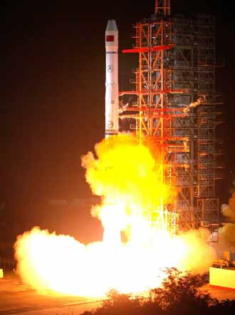 A Long March 3-A carrier rocket blasts off into the sky from the Xichang Satellite Launch Center in Southwest China's Sichuan Province early Saturday morning, carrying