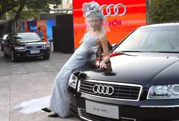 A model poses beside an Audi A8 sedan yesterday during the China (Guangzhou) Automobile Exhibition in the capital of South China's Guangdong Province. It was the first time the luxury Audi A8 had been seen in the city. [newsphoto.com.cn]