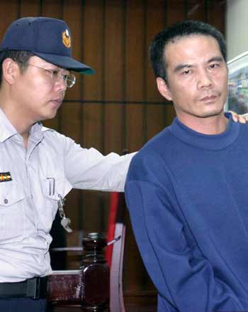 | | Wang Chung-hsing (right), prime suspect in the drowning of Chinese women smuggled across the Taiwan Straits, is sentenced to death by the Miaoli District Court of Taiwan November 25, 2003. Wang was accused of pushing 20 smuggled Chinese women into the Taiwan Straits off Miaoli County on the island's west coast while being chased by the coast guard in August. Six women died. [newsphoto.com.cn] |