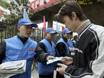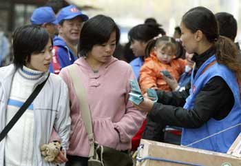 Volunteers distribute free condoms to pedestrians in China's financial capital of Shanghai November 30, 2003, the eve of World AIDS Day. [Reuters]