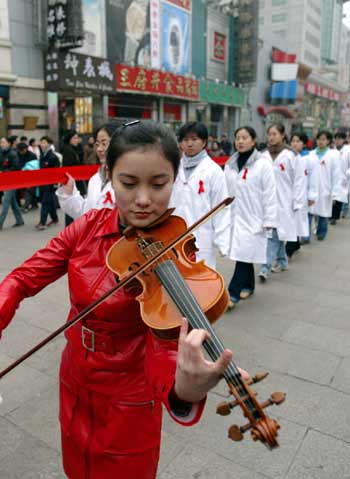Peking University students parade through a major shopping street in Beijing to promote awareness of AIDS November 30, 2003. Students handed out leaflets on AIDS and condoms on streets before the December 1 World AIDS Day as China stepped up its battle against the disease in recent months by pledging free drugs to poor people suffering from HIV, the virus which causes AIDS. [Reuters]