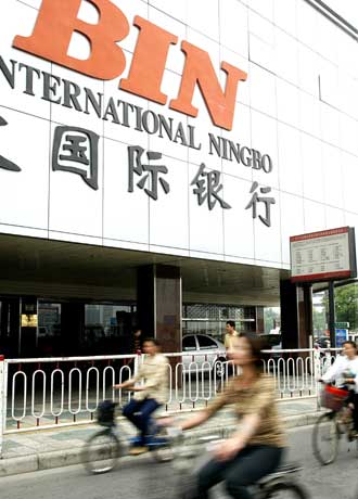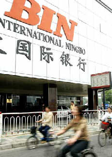 Cyclists ride their way passing an international bank branch in Ningbo, eastern China's Zhejiang Province Dec. 01, 2003. Foreign-funded banks develop rapidly in China, with 84 foreign-funded banking offices conducting RMB businesses. [Newsphoto]