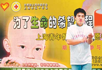 A student walks past a billboard promoting blood donation in Shanghai. The city has been advocating a voluntary system to replace the compulsory one. The Chinese characters read "Project Hope for life." [newsphoto.com.cn]