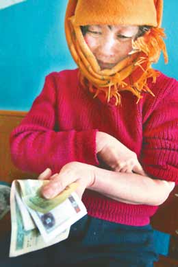 Gong Wenxia, a villager in Baishui County, Shaanxi Province, holds 75 yuan (US$9) in her hand after donating blood plasma at a collection station. Many villagers in poverty-striken areas still depend on their blood for money, unaware of the possible threat to their own lives and those of the recipients.[newsphoto.com.cn]