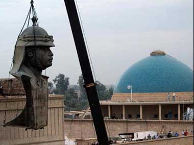 A crane puts down one of four giant bronze busts of Saddam Hussein from one of the palaces in Baghdad, Iraq December 2, 2003.  [AP]