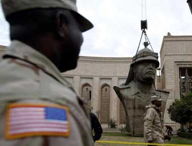 A US soldier watches workers preparing to dismantle one of the giant bronze busts of Saddam Hussein at the former presidential palace in Baghdad.  [AFP]