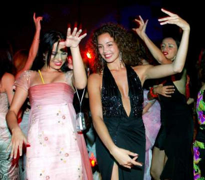 Miss Russia Svetlana Goreva (C) dances with Miss Latvia Irina Askolska (R) and Miss Barbados Racquel Olivia Wilkinson during a 'World Family Party' held for Miss World contestants in Sanya, in China's tropical island of Hainan, December 2, 2003. China will host the 2003 Miss World Finals on December 6. Photo taken December 2, 2003. [Reuters]