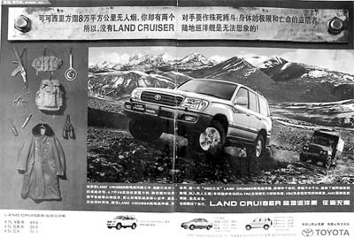 One advertisement depicts a traditional Chinese-style stone-carved lion saluting a moving Prado GX, whose Chinese translation means "despotic manner". "You have to pay respect to it," reads the slogan.