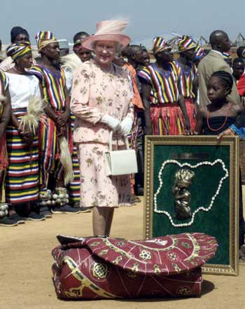 Queen Elizabeth II (C) looks at gifts she has been given during her visit to the village of Karu near Abuja in Nigeria December 4, 2003. The queen visited a compound within the village which has been built to stage a radio series.  [Reuters]
