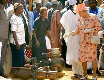 Britain's Queen Elizabeth II (R) looks at traditional pots at a mock-up market in Karu, near Abuja, Nigeria, Thursday Dec. 4, 2003, on the second day of her official visit to the West African country. The market, staffed by a mixture of actual market-sellers and actors, was built for the event as part of a BBC radio soap-opera.  [AP]