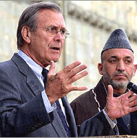 It was the second time in four months that Rumsfeld has visited Iraq, but his first to Kirkuk, the center of Iraq's northern oil industry. The trip was kept under wraps to minimize the risk of attack by Iraqi insurgents. Officials said Rumsfeld wanted to gauge for himself the progress being made to stabilize the country. On Friday in Tblisi, Rumsfeld told Georgia's leaders that the United States supports the former Soviet republic's independence and urged Russia to withdraw its troops as it promised to do four years ago. At a news conference with the acting president, Nino Burdzhanadze, Rumsfeld also cautioned that a "credible election process" leading to a scheduled Jan. 4 vote for president is "critical to stability in Georgia." Burdzhanadze, who was installed as interim president shortly before Eduard Shevardnadze was driven from power last month by protests over a fraud-tainted election, said the new leaders would maintain Georgia's push to become more integrated in the Euro-Atlantic alliance, of which the United States is the driving force. Rumsfeld got a firsthand look at Georgia's latest steps in that direction. He visited a mostly dilapidated former Soviet military base outside Tblisi where U.S. marines are training Georgian soldiers tactics to fight terrorists. The $64 million program, which began in May 2002, is coming to a close, but Burdzhanadze said at the news conference that she hopes the U.S. military help will continue in some form. The United States sees Georgia as an important partner in the Caucasus region of southwest Asia, in part because it stands in the path of a planned oil pipeline that would link the Caspian and Mediterranean seas. It also is at what some consider a crossroads for international terrorists and trafficking in weapons and drugs. Georgia has publicly backed the Bush administration's fight against terror as well as the war in and occupation of Iraq. "We have had good meetings with the president and certainly wanted to underscore America's very strong support for stability and security and the territorial integrity here in Georgia," Rumsfeld said. "The United States agrees that Russia should fulfill its commitment under the Istanbul Accords to withdraw Russian forces from Georgia." Before beginning their closed meeting, Burdzhanadze thanked Rumsfeld for U.S. support "in a very difficult period of time for our country." The United States, she said, is a "real friend." Referring to the toppling of Shevardnadze, she said, "We are proud our people showed we are ready for democracy, and we are ready to fight for democracy." She said it was important to note that the ouster of the former government was accomplished without bloodshed. Also in Rumsfeld's meeting with Burdzhanadze were two other key figures in the former opposition: Zurab Zhvaniya, now acting state minister, and Mikhail Saakashvili, considered the front-runner in the presidential contest. He has backing from all the parties that drove Shevardnadze from power. Rumsfeld is the first member of President Bush's Cabinet to visit Georgia since Shevardnadze's resignation. His trip seemed intended as much as a signal to Russia as an assertion of American support for Georgia. The Bush administration worries that Russia is moving more aggressively to assert its influence in the Caucasus and Central Asia, in ways that could impede movement toward democracy. One irritant is Russia's failure so far to remove its troops from Georgia. A 1999 deal, known as the Istanbul Accords, specified removal of most Russian troops, and the Russians already have missed several tentative deadlines. The Russian government has said it needs a decade or more for complete withdrawal of its troops, not fast enough for the Georgians.