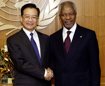 | | |  | | | Premier Wen Jiabao (L) shakes hands with United Nations Secretary General Kofi Annan in New York, December 7, 2003. Wen is expected to depart for talks in Washington D.C. where he will meet with US President George W. Bush and other senior government officials. Sino-US trade links and Taiwan issue will be the focus of the talks. [Reuters] | | | | | | | | | |