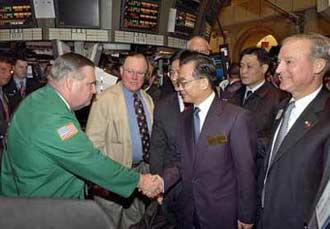 Wen Jiabao (C) waves to reporters as he tours the trading floor at