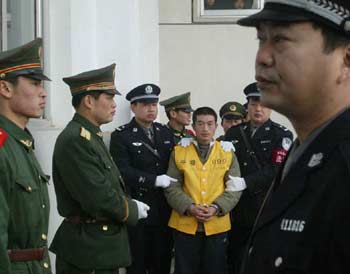 Huang Yong, the 29-year-old murderer of 17 teen-aged boys in Central China's Henan Province, is escorted to trial, December 9. 2003. He was later sentenced to death by the People's Court of Pingyu County. [newsphoto.com.cn]