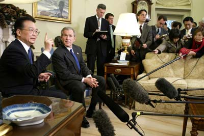 Meeting with reporters in the Oval Office after a 40-minute meeting with Chinese Premier Wen Jiabao, Bush said he had told the premier, ``The United States policy is one China.'' ``We oppose any unilateral decision by either China or Taiwan to change the status quo,'' Bush said, ``and the comments and actions made by the leader of Taiwan indicate that he may be willing to make decisions unilaterally, to change the status quo, which we oppose.'' It was the administration's strongest statement to date in opposition to Taiwan's plan to conduct a defensive referendum on March 20. Bush said his administration sees this as an indirect step toward independence. Wen said China's goal is to pursue peaceful reunification with Taiwan, ``as long as a glimmer of hope'' exists. ``Stability can only be maintained through unswerving opposition to pro-independence activities,'' Wen said. He said China sought to maintain a system of ``one country, two systems.'' ``We will do our utmost to bring about national reunification through peaceful means,'' Wen said. ``The Chinese government respects the desire of people in Taiwan for democracy, but we must point out that the (Taiwanese leaders) are only using democracy as an excuse and attempt to resort to defensive referendums to split Taiwan away from China,'' he said.