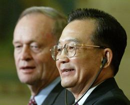 Deals for the sale of Canadian potash and Canadian wheat were also finalized at the ceremony. "We had a fruitful meeting during which we exchanged in-depth views and reached broad consensus on bilateral ties, regional and international issues of mutual interest,'' Wen said following the ceremony. "All this indicates that Sino-Canadian trade and economic co-operation are making solid headway,'' he said. Chretien echoed Wen. "Today's agreements will further enhance bilateral trade, international health and people-to-people ties and contribute to a better understanding of both countries judicial systems,'' he said. Analysts said the meeting served as a cornerstone for his Chrestien's 10-year prime ministerial career. "The stronger trade ties and economic partnership not only serve the fundamental interests of the two countries, but contribute to peace and development in the Asia-Pacific region and the world at large.'' Wen noted. During their talks, Wen said he made four suggestions, to which Chretien agreed. First, Wen said the countries should establish a research facility at the vice-ministerial level on Sino-Canadian relations and co-ordinate stance on major international issues.