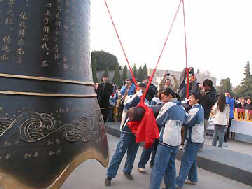 Residents in Nanjing, capital of East China's Jiangsu Province, strike the Peace Bell installed in the city on December 12, 2003, the day before the 66th anniversary of the Nanjing massacre, in which 300,000 people were killed by the Japanese invaders. [newsphoto.com.cn]