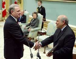 Newly sworn-in Prime Minister Paul Martin (L) shakes hands with Clerk of the Privy Council Alex Himelfarb during the ceremony at Rideau Hall in Ottawa December 12, 2003.  [Reuters]