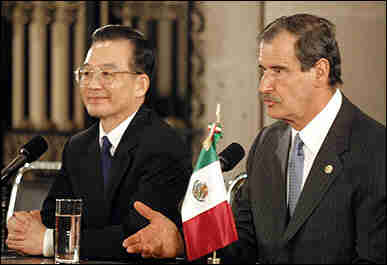 Chinese Premier Wen Jiabao and Mexican President Vicente Fox answer questions during a press conference at the Palacio Nacional in Mexico City on Friday, December 12, 2003. [AFP]