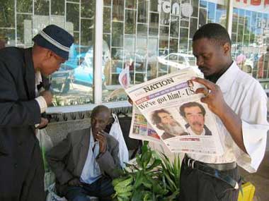 A Kenyan reads early morning newspaper reports relating to the capture of Saddam Hussein in a street of Nairobi, Kenya, Monday, December 15, 2003.  [AP]