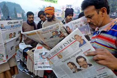 Indian men read early morning newspaper reports relating to the capture of Saddam Hussein near the railway station in Allahabad, India, Monday, December 15, 2003. Top U.S. administrator in Iraq L. Paul Bremer confirmed the capture of former Iraqi president Saddam Hussein in a house near his hometown of Tikrit, eight months after the fall of Baghdad.  [AP]