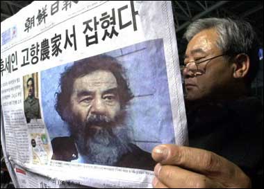 A man reads newspaper carrying the report and pictures on the capture of Iraq 's Saddam Hussein at a train station in Seoul. South Korea welcomed the capture of former Iraqi president Saddam Hussein as markets soared on hopes that peace will now take root in Iraq. [AFP]