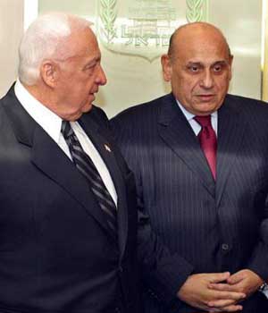 Israeli prime minister Ariel Sharon, left, meets Egyptian foreign affairs minister Ahmed Maher in Sharon's office in Jerusalem Monday Dec 22, 2003.[AP]