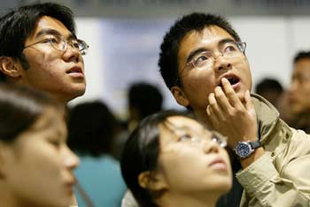 University students, who are going to graduate in the summer of 2004, look at employment information at a job fair in Hangzhou, east China's Zhejiang Province, last month. [newsphoto.com.cn/file]