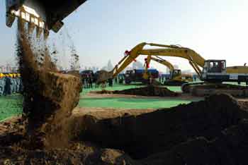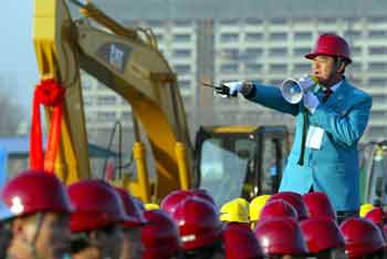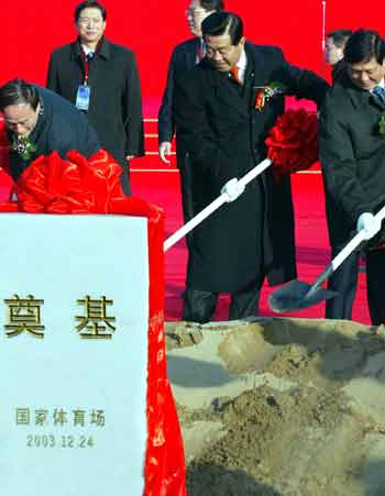 Municipal Committee (R) and acting Beijing Mayor Wang Qishan break the