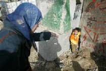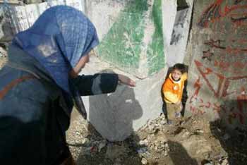 A Palestinian woman, after climbing over the barrier, calls her small boy as he comes through a gap in a concrete barrier which separates the West Bank from Jerusalem, in the East Jerusalem neighborhood of Abu Dis, Sunday, Dec. 28, 2003. [Reuters]