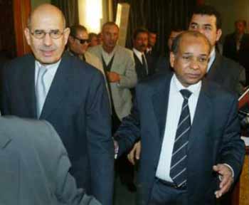 International Atomic Energy Agency(IAEA) Director General Mohamed El Baradei(L) and Libya's Foreign Minister Mohamed Abderrhmane Chalgam leave a news conference in Tripoli, December 27, 2003. Chalgam said that his country would definitely sign a protocol permitting more intrusive snap inspections of all Libya's nuclear facilities. [Reuters]