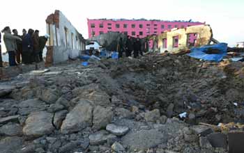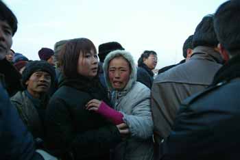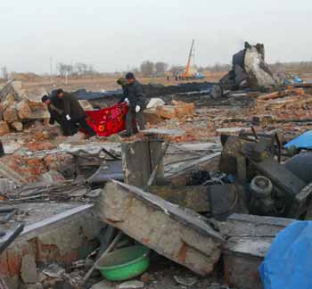 People carry away the body of a victim in a tragic explosion at a fireworks factory in Tieling, Northeast China's Liaoning Province December 30, 2003. The blast killed 38 people, injured several others and totally destroyed the plant. [newsphoto]
