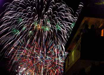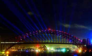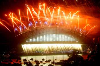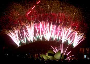 Fireworks explode over the Sydney Opera House and Harbour Bridge as part of new years celebrations January 1, 2004. An estimated crowd of one million people lined the harbour foreshore to watch the fireworks display from the bridge to welcome the new year. [Reuters]