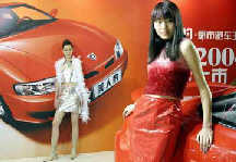 Chinese models pose in a newly opened auto showroom in Beijing. China has started slashing its average import tariff rate to 10.4 percent from the current 11 percent.