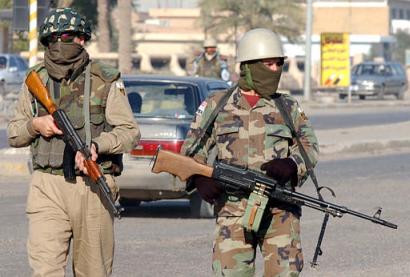 Iraqi Civil Defense Corps (ICDC) members cover their faces with scarves, during a joint patrol with U.S. Army soldiers from the 4th Infantry Division in Saddam Hussein's hometown of Tikrit, north of Baghdad, Friday, Jan 2, 2004. Some ICDC members cover their faces for fear of being recognized, and targeted by insurgents attacking Americans and their Iraqi allies. [AP]