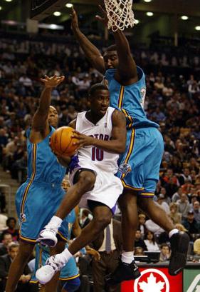 | | Baron Davis scored 22 points and the New New Orleans Hornets forwards David West, left, and Robert Traylor, right, defend as Toronto Raptors guard Milt Palacio (10) looks to pass during first-half NBA action in Toronto on Friday, January 2, 2004. [AP] |