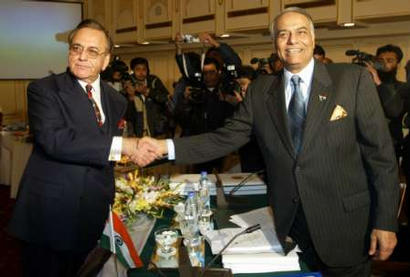 Mahmood Kasuri (L) and his Indian counterpart Yashwant Sinha shake hands