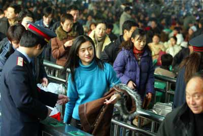 Passengers pass through ticket-checking point at the Beijing West Railway Station January 5, 2004. Nearly 140 million people are expected to take the train during this year's Spring Festival travel season, which started on Sunday and will last for 40 days. [newsphoto.com.cn]