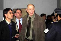 Jack Pritchard, second left, a former U.S. State Department official, and John W. Lewis, center, professor emeritus of international relations at Standford University, arrive at Sun An Airport in Pyongyang, capital of North Korea, Tuesday, Jan. 6, 2004.  [AP]