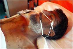 An Iranian man pulled from earthquake rubble lies in a coma in a Ukrainian hospital in Bam, Iran January 8, 2004.   [Reuters]