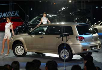 Beijing Jeep on Saturday, Jan. 10, 2004, launches the Outlander CUV (car-based utility vehicle) of Japan's Mitsubishi Motor Corp, 37.3 per cent owned by DaimlerChrysler in Beijing. [newsphoto.com.cn]